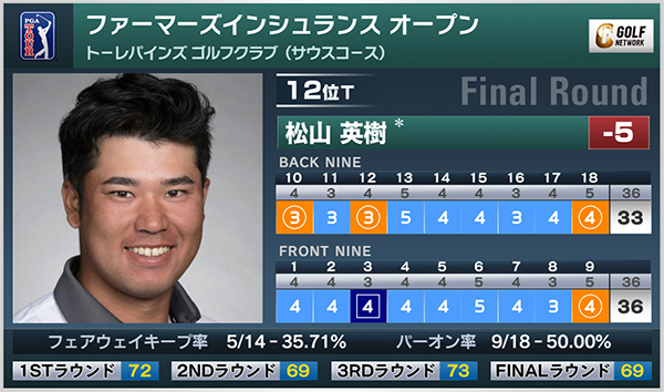 前日44位タイに後退した松山英樹はインスタートのこの日、10番、12番で5メートル超のパットを沈めバーディとすると、18番でもスコアを伸ばすことに成功。後半も1ボギーの後、上りホールで絶妙なアプローチを見せてバーディ奪取。トータル4バーディ、1ボギーの「69」で回り、通算5アンダー12位タイで大会を終えた。