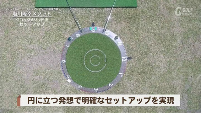 今回は2017年「PGAティーチングプロアワード」で最優秀賞を受賞した塩川隆幸氏が登場。時計盤型のマット「クロックディスク」を使用した基本スイングの習得法である「クロックメソッド」。“円の上に立つ”発想で、時計盤を使って“1分”という角度を覚えると自在なボールを打つことができるという塩川氏のメソッドとは?