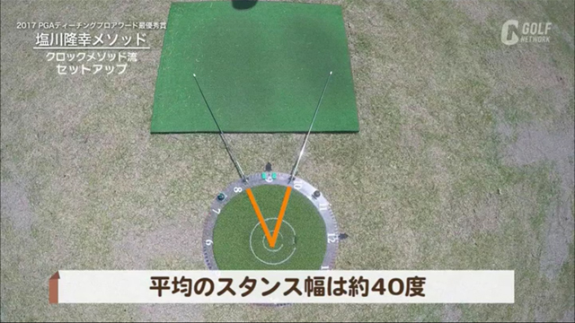 塩川プロ 次はクラブ別のボールポジションとスタンスをクロックディスクを使って説明していきたいと思います。このスタンスガイドはセンターピボットからの角度に設定しています。平均のスタンス幅は40度になっていますので、クロックディスクの間隔を7分に設定しています。この指標を使えば、距離に応じてのボールとの距離、スタンスの幅が決まると考えています。