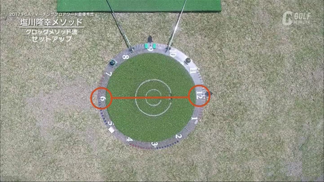 まず初めにクロックメソッドの説明をしたいと思います。練習場で例えば四角いマットに立っていたり、平行な棒を引いて練習している方もいらっしゃると思います。そのような平行な練習に私は少し疑問を感じていました。円に立つ発想に時計の文字を加えたことで明確なセットアップを可能にして、今まで平行ではできなかったことが解消できるようになりました。