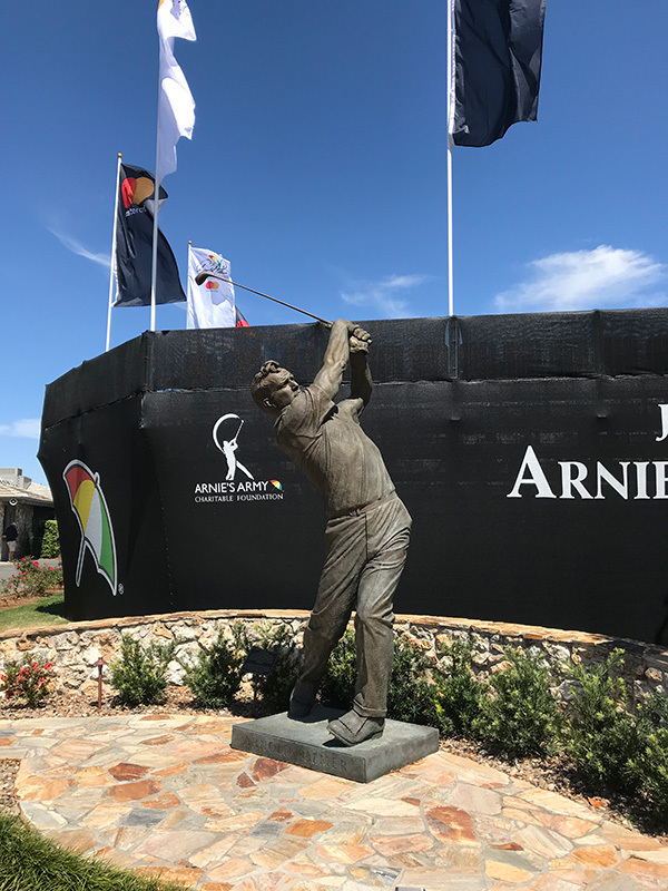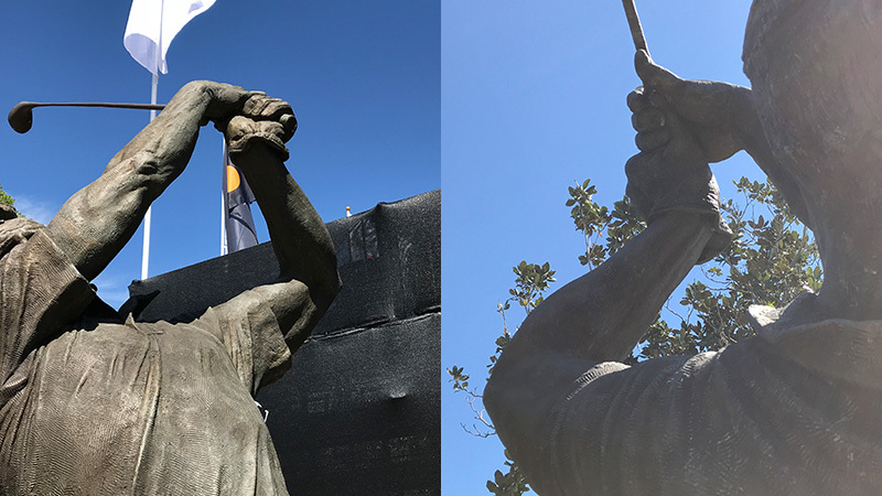 うん、ベイヒルいいトーナメントです。スタートティーの脇にはパーマーさんの銅像が。見事なフィニッシュです。手首のキマリ方、参考にします。
