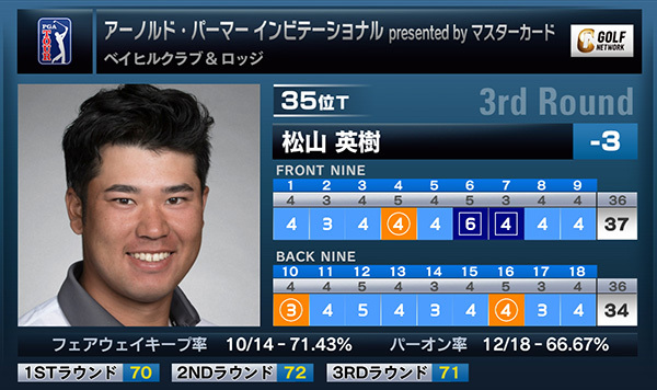 31位からスタートした松山英樹は、4番パー5でこの日最初のバーディを奪うも、6番から連続ボギーとスコアを落として前半を終える。すると10番のセカンドを約1メートルに寄せる絶妙なアプローチを見せ、バーディを奪取。16番パー5でもスコアを伸ばし、トータル3バーディ、2ボギーの「71」でホールアウトするも、通算3アンダー35位タイに順位を下げて最終日を迎える。