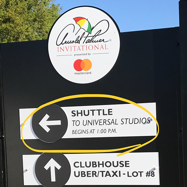 フェアウェイ左サイドにはバスやUBERの案内表示。その中にひとつ・・・午後1時からユニバーサルスタジオへのシャトルバスも発車します。というのもコースからユニバーサルスタジオまではわずか15分なんですね。