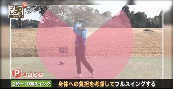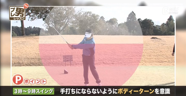 そして、3時から9時のスイング。足の幅が2つ入るくらいにします。手打ちになりやすいので、体の回転をしっかり入れてスイングを行うようにして下さい。