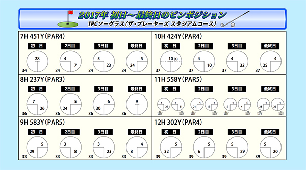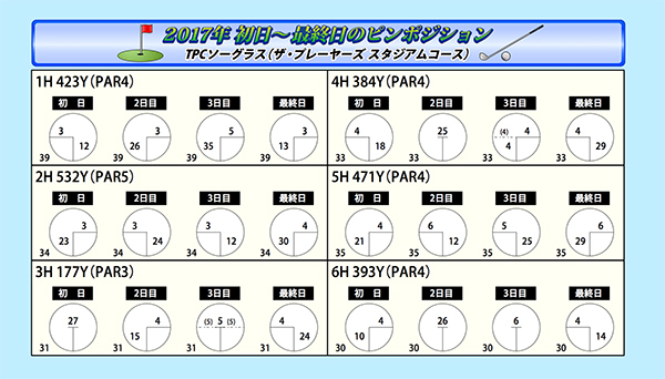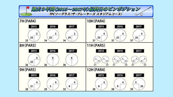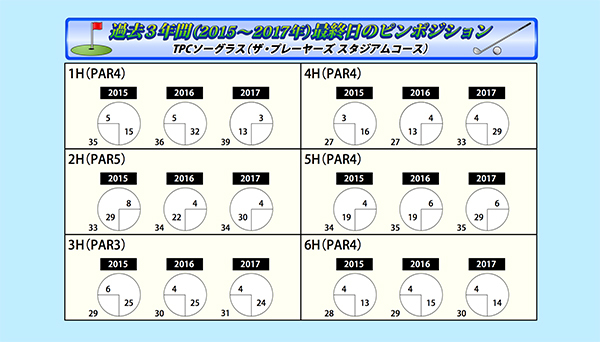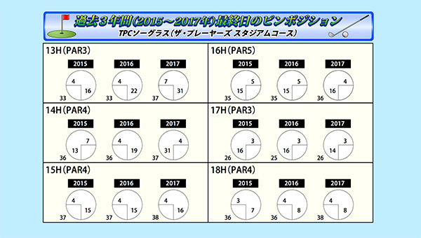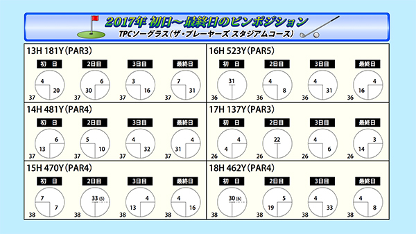 どうでしょう?ちょっと傾向と対策が見えてきますかね??ほぼ変わっていないピンポジションなのは・・・3番、6番、7番、10番、15番、16番、17番、18番という感じでしょうか。2年ごと手前、奥と振っているホールもありますね。