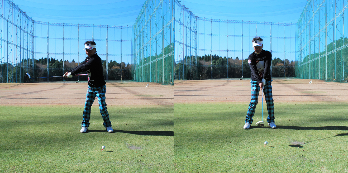 レッスンの際、「スイング中、グリップはお腹を刺す(向く)ように」というアドバイスを受けたことがある人も多いと思いますが、それを具体化したのがこのドリルです。お腹にグリップエンドをくっつけてスイングすることで、体の正面にグリップを置いておくためにはどういう体の動かし方をすればいいかがわかります。