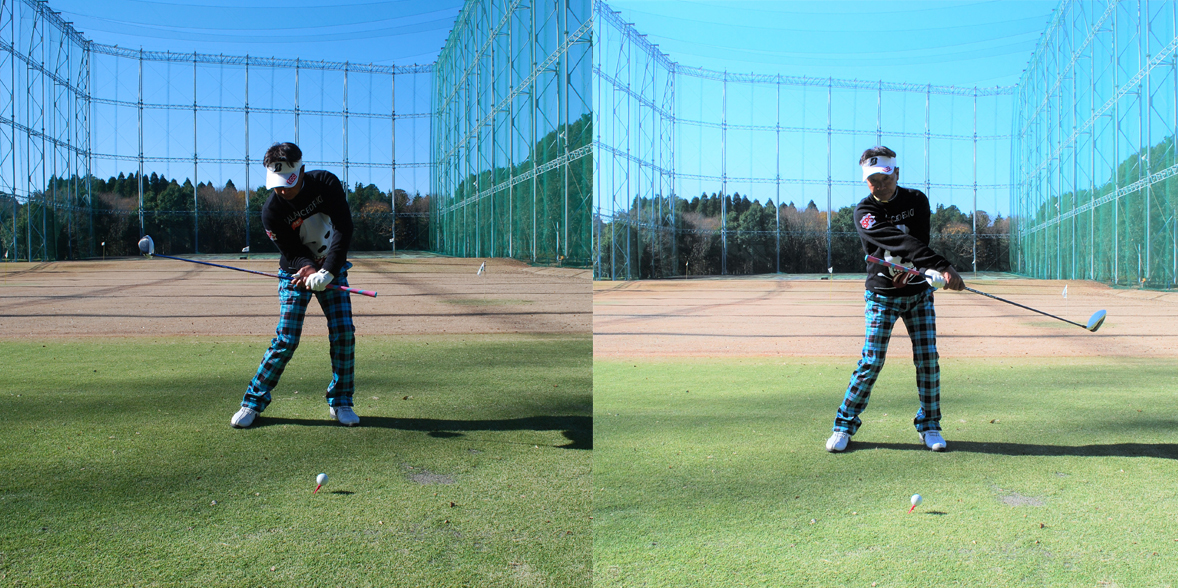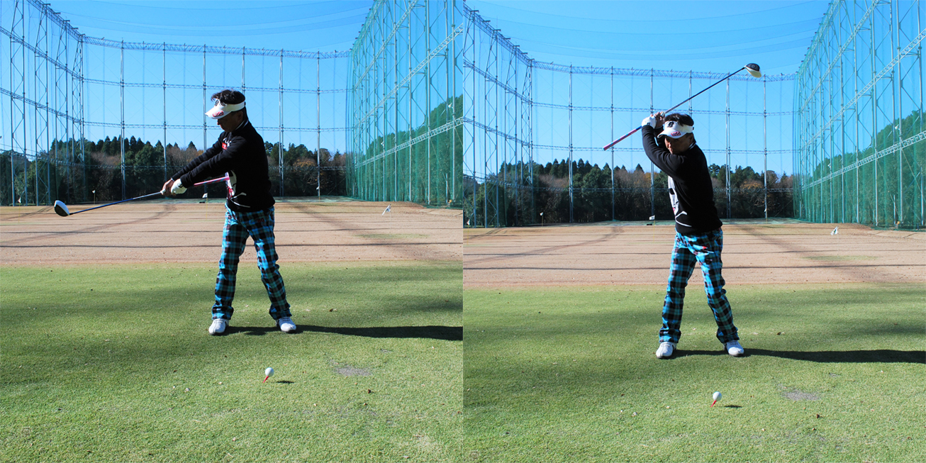 普段のスイングで、ダウンスイングで溜めすぎていた人(同⑦)や、インパクト~フォロースルーで手首を返しすぎていた人(同⑧)は、このドリルをやるとかなり違和感を覚えると思いますが、ボールを曲げないためには正しい動きを覚えることが大事。