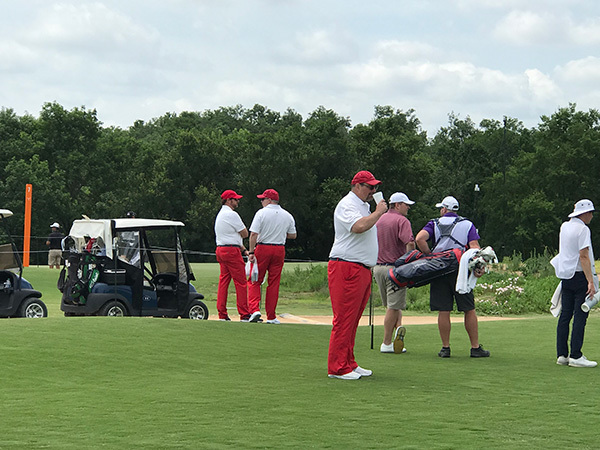 赤いズボン、白いポロシャツの決まり衣装がコースに映えます。