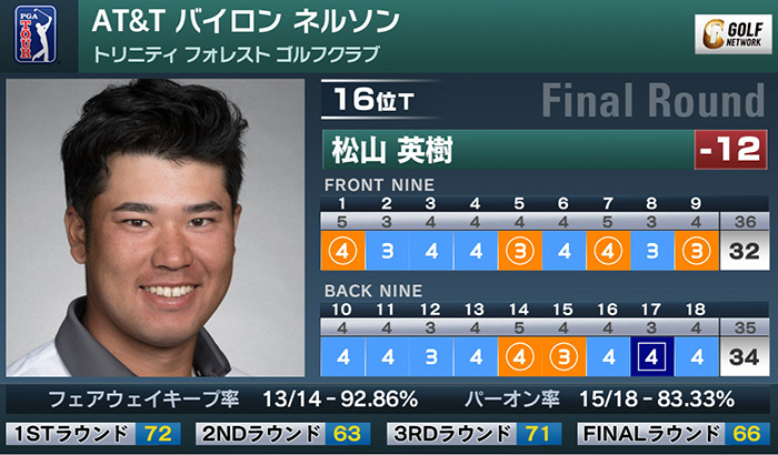 29位タイからスタートした松山英樹は前半に4つのバーディを奪うなど、トータル6バーディ、1ボギーの「66」で回り、通算12アンダー16位タイで大会を終えた。