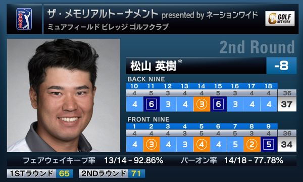 米男子ツアーのザ・メモリアル・トーナメント presented by ネーションワイド(現地時間1日/オハイオ州 ミュアフィールド・ビレッジGC)第2ラウンドが終了。松山英樹は、4バーディ、3ボギーの1アンダー71で回り、通算8アンダー4位タイで決勝ラウンドへ進む。