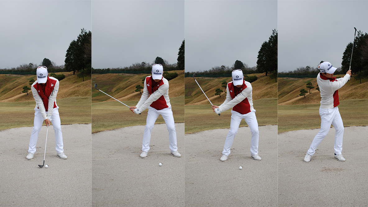 ヘッドを加速させるためには、力まないことも大事です。力強く砂を叩くのではなく、ボールの下を潜らせればいいだけなので、力は必要ありません。打つ前に、肩の力を抜いてリラックス。距離に合わせた振り幅を決めたら、あとはヘッドを加速させることだけを考えて、フィニッシュまでしっかり振り抜く。この練習をいつもやっていれば、本番でも自信を持ってバンカーショットに臨めるはずです。