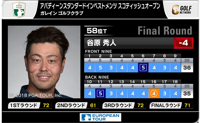 欧州ツアーのロレックスシリーズ第5戦 アバディーンスタンダードインベストメンツ スコティッシュオープン(現地時間15日/スコットランド ガレインGC)最終ラウンド後に谷原秀人がインタビューに答えた。