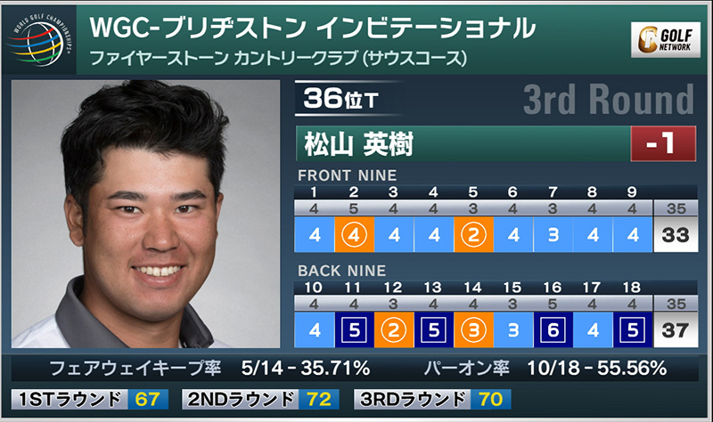 米男子ツアーの世界選手権(WGC)シリーズのWGC-ブリヂストンインビテーショナル(現地時間4日/オハイオ州ファイヤーストーンCC)第3ラウンドが終了。大会連覇を狙う松山英樹は4バーディ、4ボギーのイーブンパー「70」で、通算1アンダー36位タイで3日目を終えた。