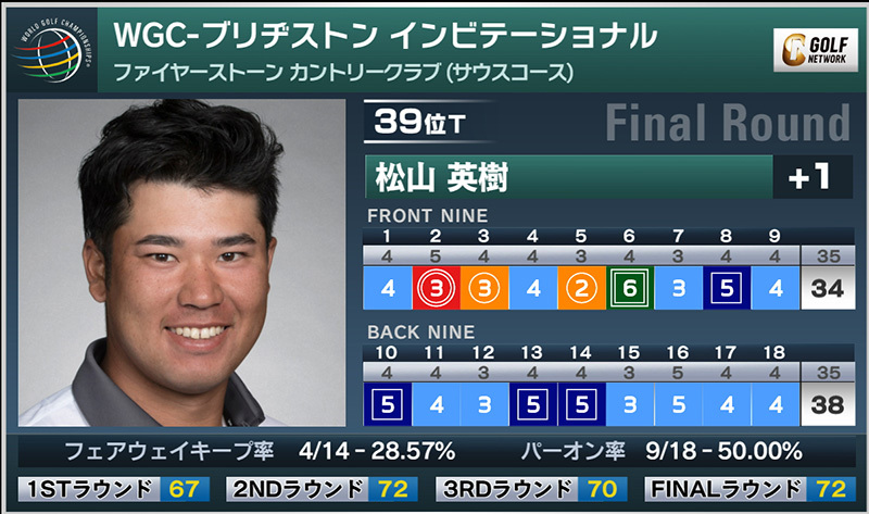 米男子ツアーの世界選手権(WGC)シリーズのWGC-ブリヂストンインビテーショナル(現地時間5日/オハイオ州ファイヤーストーンCC)最終ラウンドが終了。昨季覇者の松山英樹は1イーグル、2バーディ、4ボギー、1ダブルボギーの2オーバー72とスコアを落とし、通算1オーバー39位タイで大会を終えた。