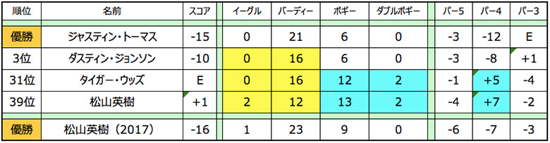 イーグル&バーディーに対してのボギー&ダブルボギー表、そしてパー5、パー4、パー3 別に分けた表です。ご覧の通り、今年優勝したトーマスと昨年優勝の松山のアンダーパーが優れているのは当たり前ですが、意外にも3位だったDJと31位のタイガー、39位の松山のアンダーパーが16アンダーで一緒だったこと。 差が表れたのは松山はパー4で通算7オーバー。 前年度優勝時は通算7アンダーだったので、今年はパー4のホールでのプレーが響いてしまったようです。