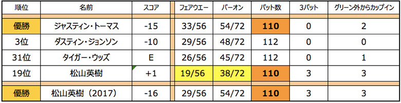 これもどちらかというとベーシックな基本的データ。フェアウェーキープ、パーオン、合計パット数。 大会前からショットに不安を抱えていると語っていた松山のフェアウエーキープ、パーオンが劣っているのがわかりますね。しかし合計パット数は4日間で110パットと、優勝したトーマスや前年度16アンダーで優勝した時と全く同じでした。通算イーブンパーだったタイガーも、10打差をつけられたダスティン・ジョンソンと比べて4日間で合計パット数は同じ、フェアウェーとパーオンの数字でもあまり大きな差はありません。
