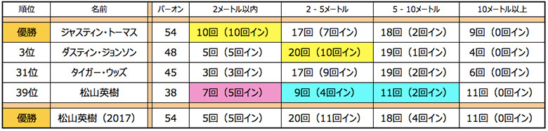 松山は4日間のパーオンが38回のみとショットメーカー松山らしくない数字になってしまいましたが、2メートル以内のチャンスは7回と優勝した前年度(5回)よりも2メートル以内のチャンスは多かったのは意外でした。しかし2メートルから5メートル以内のチャンスは4日間で9回、5〜10メートルも他の選手と比べると劣っていて全体的にチャンスは少なかったようです。