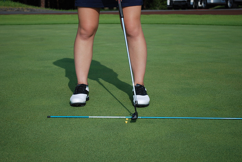 まず、ラインに沿ってスティックを置き、ボールの先5センチぐらいのところにティーを2つ刺します(写真①)。2つのティーの間隔はボールよりも少し広め。ティーの高さは、2センチ程度に設定してください。