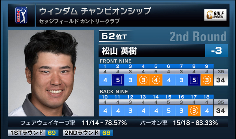 米男子ツアーのウィンダムチャンピオンシップ(現地時間17日/ノースカロライナ州 セッジフィールドCC)第2ラウンドが終了。松山英樹は4バーディ、2ボギーの2アンダー68で回り、通算3アンダー52位タイで決勝ラウンド進出を決めた。