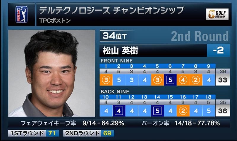米男子ツアーのプレーオフシリーズの第2戦 デルテクノロジーズ チャンピオンシップ(現地時間1日/マサチューセッツ州 TPCボストン)第2ラウンドが終了。松山英樹は5バーディ、3ボギーの2アンダー「69」でプレーし、通算2アンダー34位タイで決勝ラウンド進出を決めた。