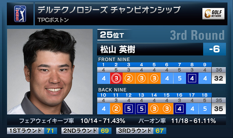 米男子ツアーのプレーオフシリーズの第2戦 デルテクノロジーズ チャンピオンシップ(現地時間2日/マサチューセッツ州 TPCボストン)第3ラウンドが終了。松山英樹は1イーグル、6バーディ、4ボギーの4アンダー67で回り、通算6アンダー25位タイで最終日を迎える。
