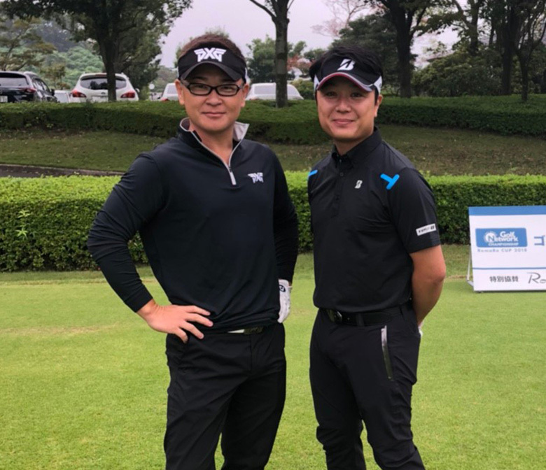 そして、インスタートで見事トップ通過を果たしたのは、昨年の決勝大会で7位に入った東京都から参加の小原淳さん・鷺一成さんチーム。今年は全身黒コーデでキメたおふたり。見事ハーフ35(-1)で決勝大会進出を決めました。