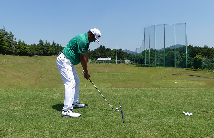 まず練習では、スティック(クラブでも可)などを使って真っすぐを確認します。