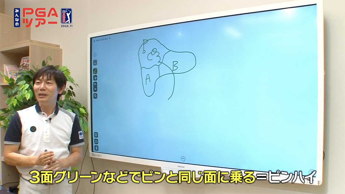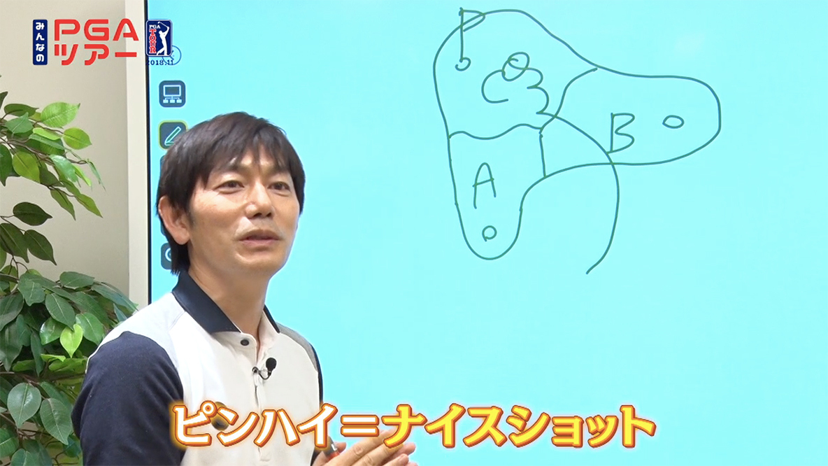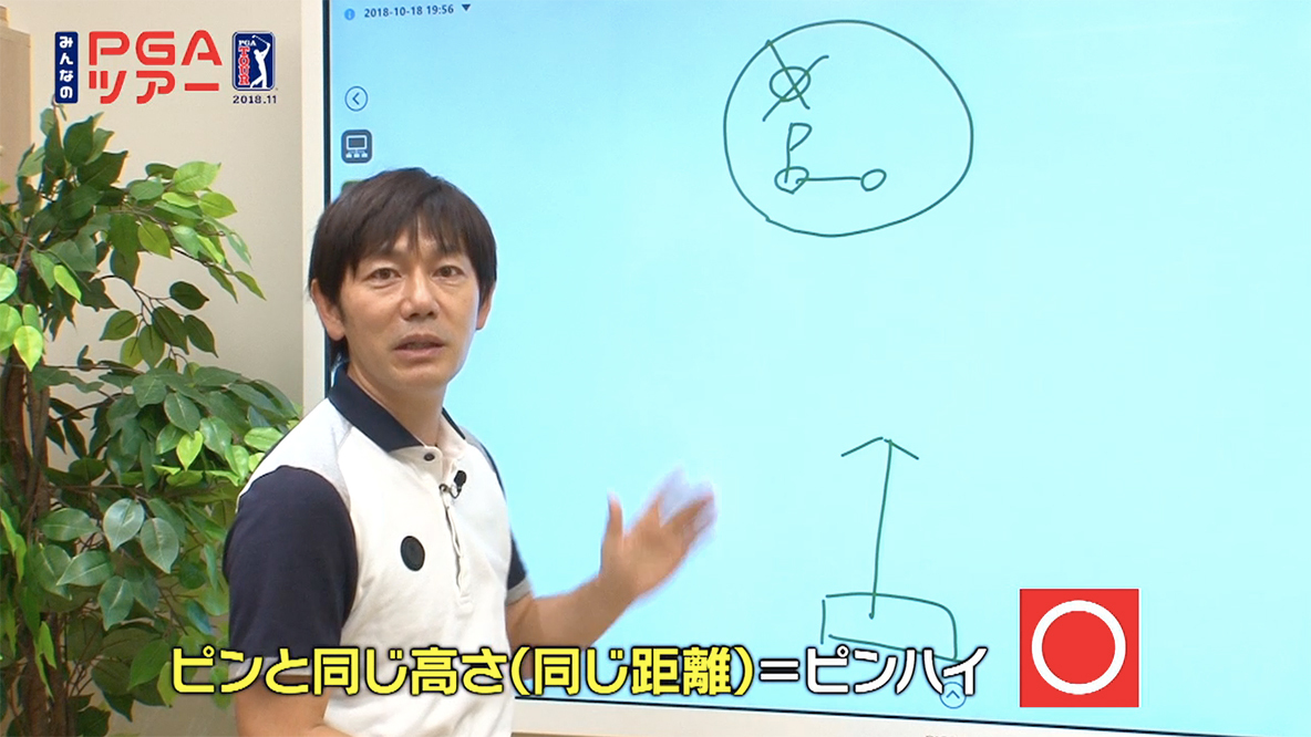 細かく2つ分けると、ピンと同じ高さにつく、いろいろなグリーン面があったときに同じ面に乗るのがピンハイ。私やアナウンサーの方が「ピンハイですね」と言ったときは「ナイスショットだったんだな」と思ってもらえればと思います。ピンの奥に行くとピンハイというのは間違いですよ。
