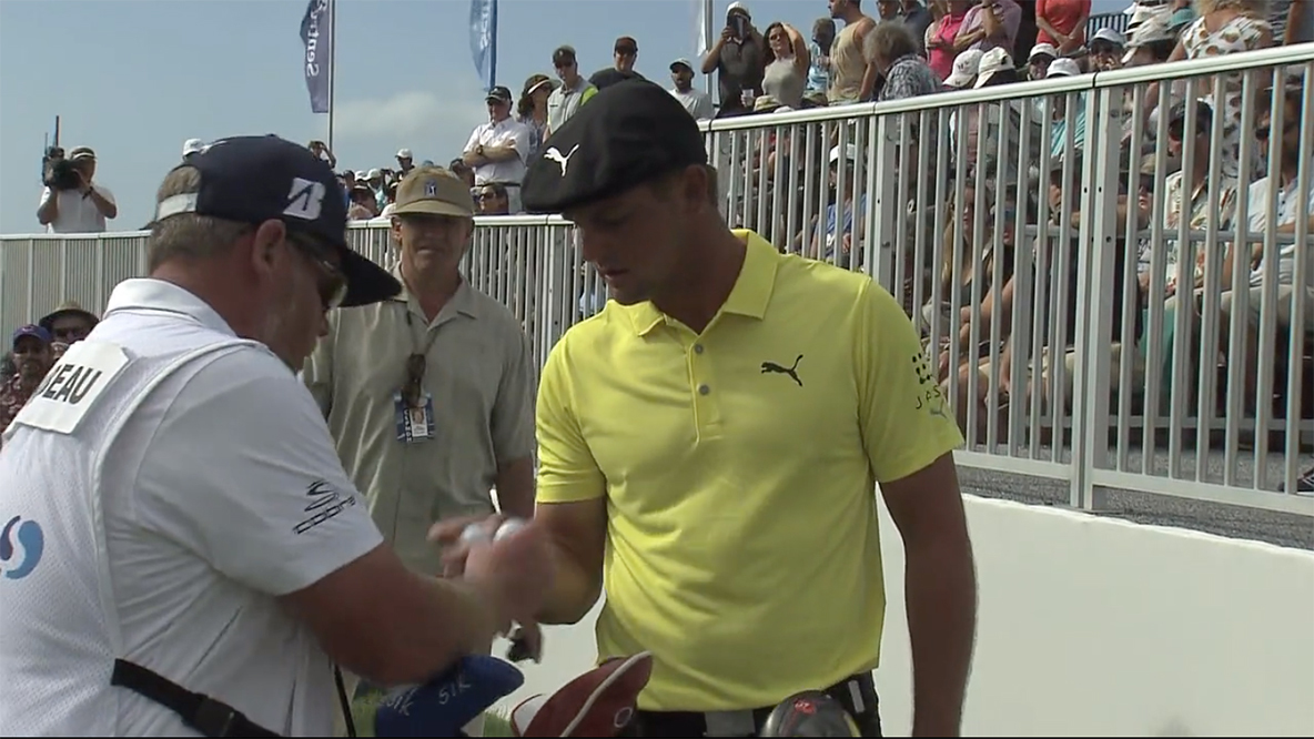 さらに、このケースでの新ルールが2つ。救済のニアレストポイントから1クラブレングスの距離にボールをドロップすることになりますが、その距離を測るクラブはパター以外の最も長いクラブ(実質ドライバー)となります。そして、これまではホールアウトするまで認められなかったボール交換も、救済を受ける際は可能となり、実際、デシャンボー選手はボールの傷をチェックした後でキャディから新しいボールを受け取って交換していました。