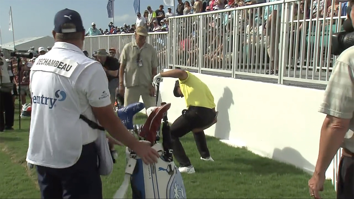 そんななか、大会3日目に新ルールと従来のルールとトーナメントならではのルールが混在したケースがありました。プレーヤーは先述のデシャンボー選手。同大会を中継したCS放送ゴルフネットワークの独自カメラがその一部始終を追いかけました。