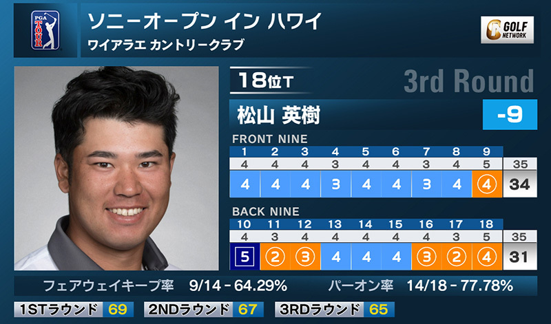米男子ツアーの米男子ツアーのソニーオープン イン ハワイ(現地時間12日/ハワイ州/ワイアラエCC)3日目が終了。松山英樹は3連続バーディを含む、6バーディ、1ボギーの65を叩き出し、通算9アンダー18位タイに浮上している。