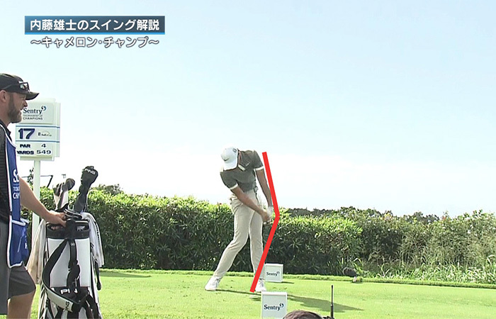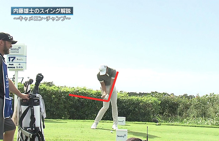キャメロン・チャンプが飛ばせる理由について、当然チャンプが柔軟な体とバネのある筋肉を持っているということはあるのですが、まずバックスイングの特徴として、スイングを正面から見たときに、下半身は静かな状態で右の肩甲骨がみえてくるほどの強い捻転をしていることがわかります(写真①)。