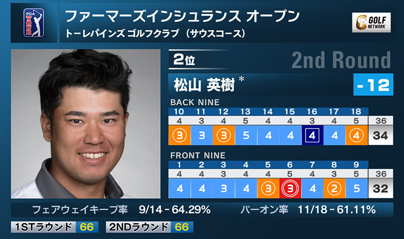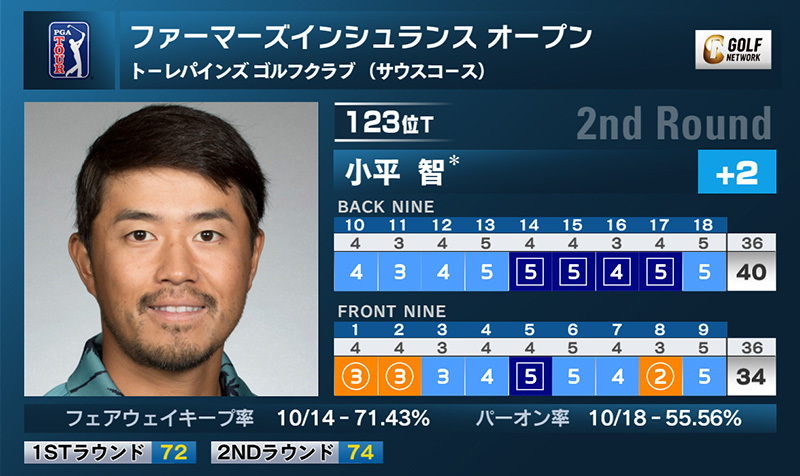 米男子ツアーのファーマーズインシュランスオープン(現地時間25日/カリフォルニア州/トーレパインズGC ノースコース&サウスコース)第2ラウンドが終了。松山英樹と小平智は同組で回り、松山は首位と3打差の通算12アンダー単独2位、小平は通算2オーバーで予選落ちとなった。