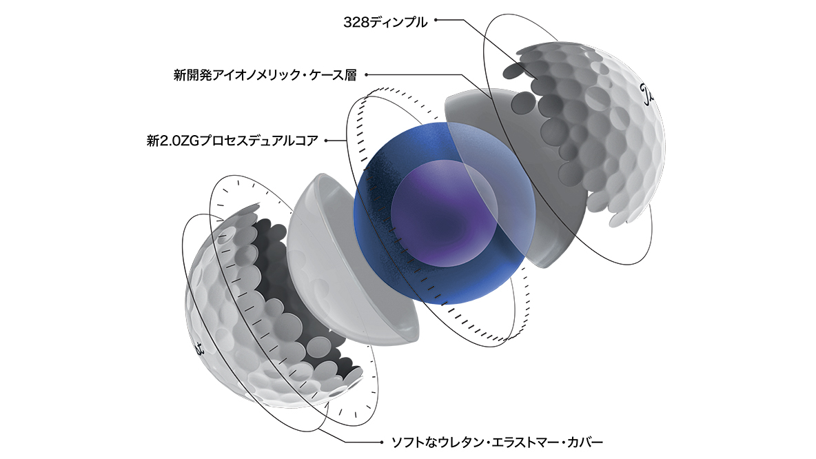 プロV1同様に新2.0ZGコアと新開発ケース層を搭載したことでボール初速が向上し、バックスピン量を低減。前モデルに比べ、ドライバーからアイアンまで飛距離性能が向上しているほか、328ディンプルデザインが、理想的な高めの中高弾道を実現する。独自のソフトなウレタン・エラストマー・カバーは、ショートゲームで優れたスピンコントロール性能ほ誇り、前モデルと同様に、ソフトで芯を感じる打感となっている。