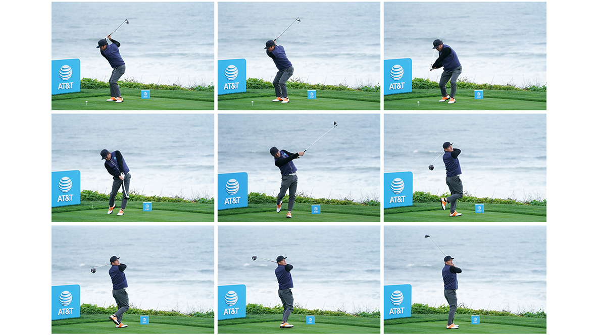 佐藤 「僕が解説するよりもピーター・コステスが何を言っているか聞きたいですけど(笑)。(バックスイングは)アウトサイドに上げて、体をよじって力を出していると。セットアップの前傾姿勢はスタンダードで、凄く右を向いていますが、腰も肩もよくターンしています、トップで(シャフトが)クロスしているのもスタンス通りに向いているためで、ダウンスイングで一気にローテーションをガッと加えることで力を出しています、ということですね」