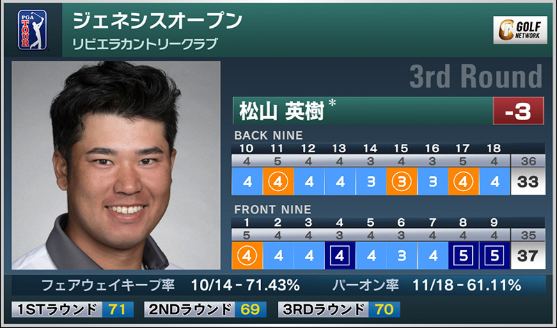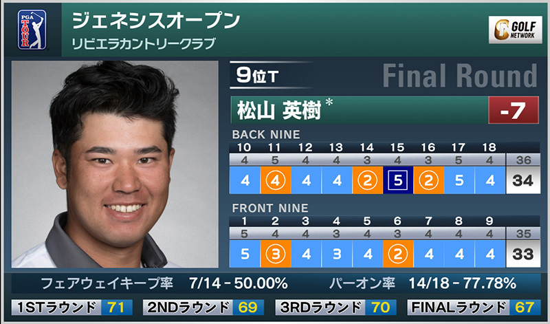 米男子ツアーのジェネシスオープンは現地時間17日、カリフォルニア州のリビエラCCを舞台に第3ラウンド(未消化分)と最終ラウンドが行われ、松山英樹は通算7アンダー9位タイで終え、3戦連続のトップ15フィニッシュとなった。