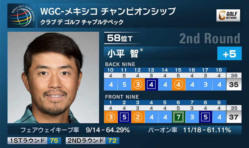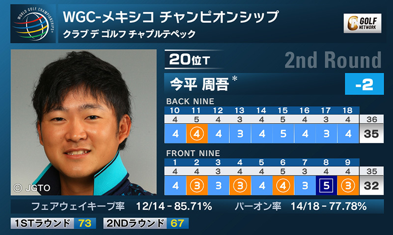 世界ゴルフ選手権シリーズのWGC メキシコ チャンピオンシップ(現地時間22日/メキシコ/クラブ デ ゴルフ チャプルテペック)第2ラウンドが終了し、今平周吾が通算2アンダー20位タイ浮上。松山英樹は通算イーブンパー28位タイ、小平智は通算5オーバー58位タイとなっている。
