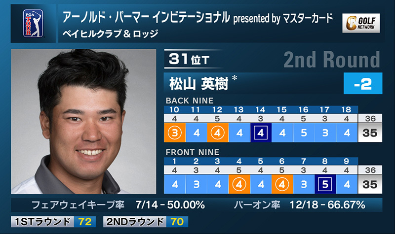 米男子ツアーのアーノルド・パーマーインビテーショナル presented by マスターカード(現地時間8日/フロリダ州/ベイヒルクラブ&ロッジ)第2ラウンドが終了。松山英樹は4バーディ、2ボギーの2アンダー70で回り、通算2アンダー31位タイに浮上した。