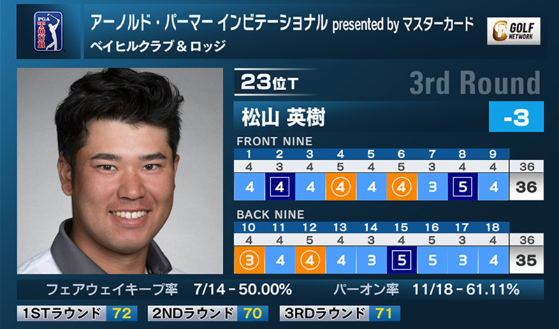 米男子ツアーのアーノルド・パーマーインビテーショナル presented by マスターカード(現地時間9日/フロリダ州/ベイヒルクラブ&ロッジ)第3ラウンドが終了。松山英樹は4バーディ、3ボギーの1アンダー71で回り、通算3アンダー23位タイで最終日を迎える