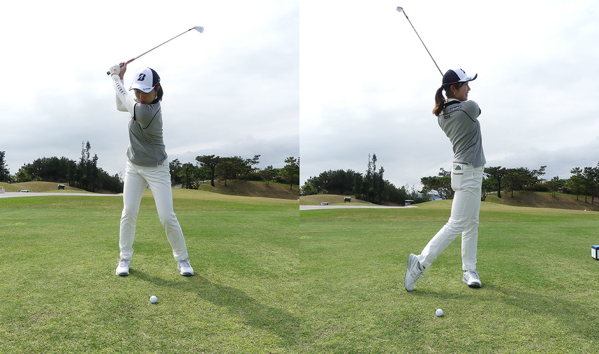大里桃子、低い球を打つときはボール1個分右側に 短く持ってコンパクトスイング