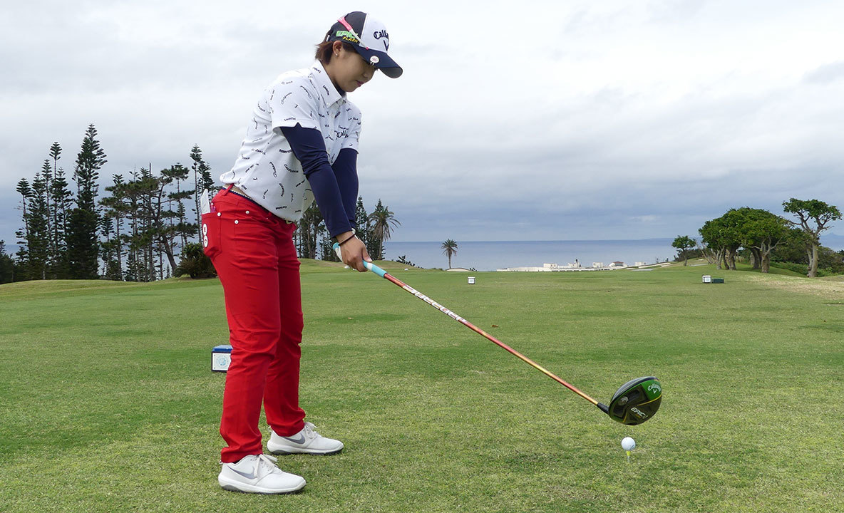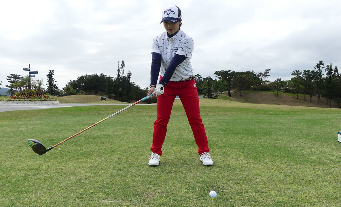 「小さい(身長151cm)わりに良く飛ぶね」と言われ、その秘訣を聞かれることも多いのですが、私の場合、特に「これが飛びのコツ」というものはありません。ただ、ドライバーを打つときは、「テークバックの際、右足の前まではクラブを真っ直ぐ引く」ということだけは強く意識しています。