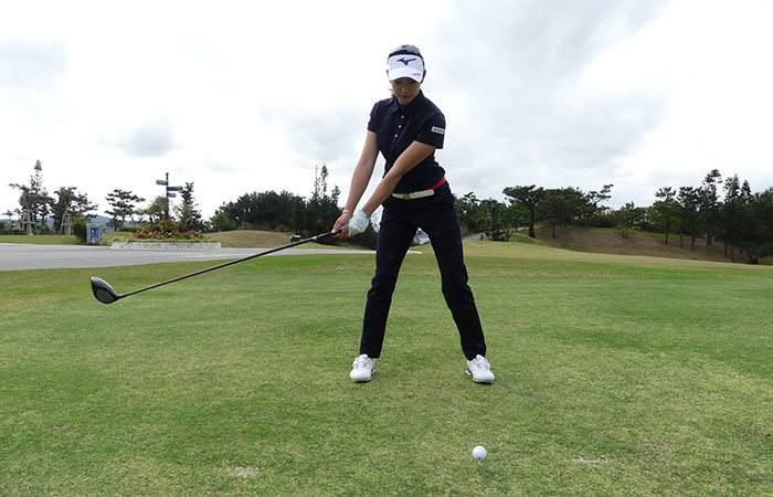 アマチュアゴルファーの中にも、「力のわりに飛距離が出ない」と悩んでいる人が多いようですが、そのほとんどが“軸ブレ”に原因があるように思います。どんなに力があっても、バックスイングで体が流れてしまっては、せっかくのパワーをボールに伝えることができません。スエー気味の人は、私のように、「お腹を動かさずに真っ直ぐ引く」を意識してみてください。特別に力を入れなくても、飛距離がアップするはずです。