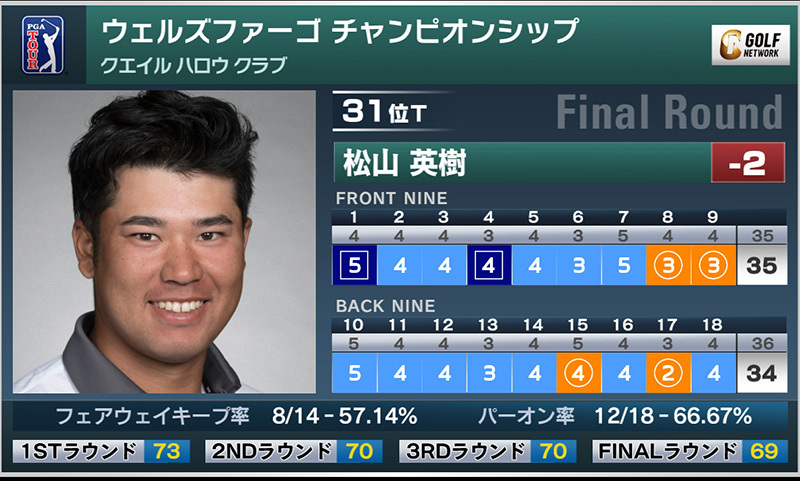 米男子ツアーのウェルズファーゴ チャンピオンシップ(現地時間5日/米ノースカロライナ州/クエイルホロークラブ)最終ラウンドを終え、松山英樹は4バーディ、2ボギーの2アンダー69で回り、通算2アンダー31位タイで4日間を終えた。