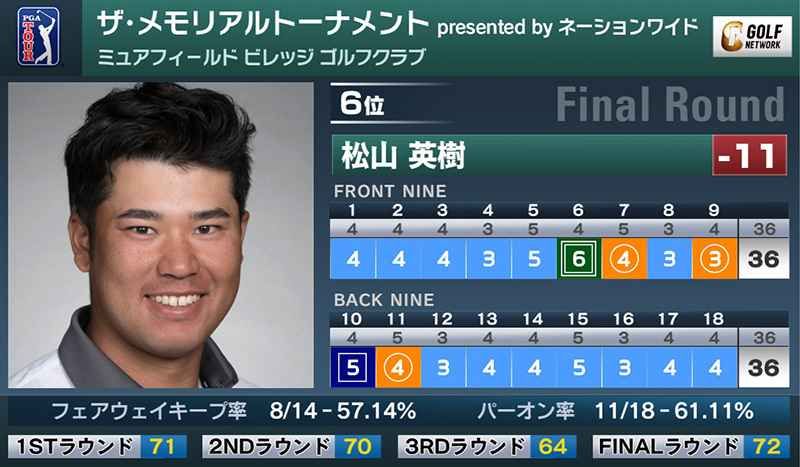 米男子ツアーのザ・メモリアルトーナメント presented by ネーションワイドは2日、米オハイオ州のミュアフィールドビレッジゴルフコース(7392ヤード・パー72)で最終ラウンドが行われた。松山英樹は通算11アンダー単独6位に入り、今季4度目のトップ10フィニッシュとなった。