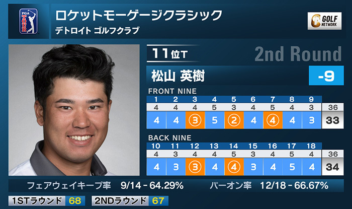 米男子ツアーのロケットモーゲージクラシックは28日、米ミシガン州のデトロイトゴルフクラブで第2ラウンドが行われ、松山英樹は5バーディ、ノーボギーの「67」で回り、首位と5打差の通算9アンダー11位タイに浮上している。