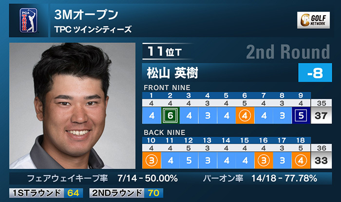 米男子ツアーの新規大会「3Mオープン」は5日、米ミネソタ州のTPCツインシティーズ(7468ヤード・パー71)で第2ラウンドが行われ、松山英樹は4バーディ、1ボギー、1ダブルボギーの「70」で回り、通算8アンダー11位タイで週末を迎える。