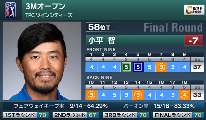 米男子ツアーの新規大会「3Mオープン」は7日、米ミネソタ州のTPCツインシティーズ(7468ヤード・パー71)で最終ラウンドが行われ、小平智は4バーディ、1ボギー、1ダブルボギーの「70」で回り、通算7アンダー58位タイで4日間を終えた。