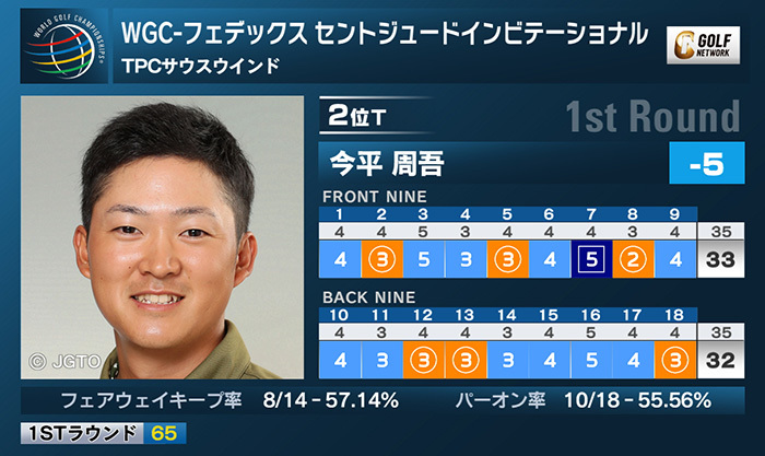 世界選手権シリーズのWGC-フェデックスセントジュードインビテーショナル(7237ヤード・パー70)は25日、米テネシー州のTPCサウスウィンドで第1ラウンドが行われ、今平周吾は6バーディ、1ボギーの「65」を叩き出し、首位と3打差の5アンダー2位タイと好スタートを切った。