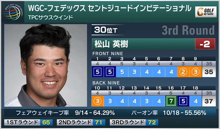 世界選手権シリーズのWGC-フェデックスセントジュードインビテーショナル(7237ヤード・パー70)は27日、米テネシー州のTPCサウスウィンドで第3ラウンドが行われた。松山英樹は3バーディ、3ボギー、1ダブルボギーの「72」とスコアを落とし、通算2アンダー30位タイで3日目を終えている。