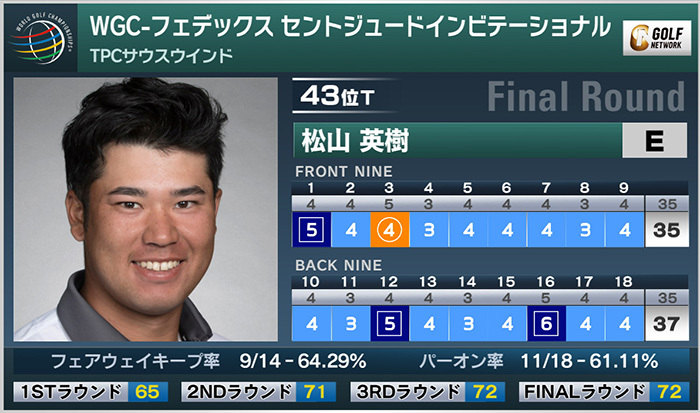 世界選手権シリーズのWGC-フェデックスセントジュードインビテーショナル(7237ヤード・パー70)は28日、米テネシー州のTPCサウスウィンドで最終ラウンドが行われ、松山英樹は1バーディ、2ボギーの「72」とスコアを落とし、通算イーブンパー43位タイで4日間を終えている。